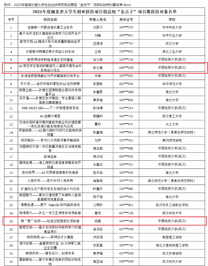 近日,2025年度湖北省大学生创业扶持项目创意组“金点子”项目名单正式公示,由未来技术学院2023级硕士研究生张云豪负责的项目《AI视觉孪生驱动的智能无人遥感操作撬毛台车系统设计优化》、2023级博士生杨霄负责的项目《新“智”钻探——钻进过程智能化领航者》成功入选。
