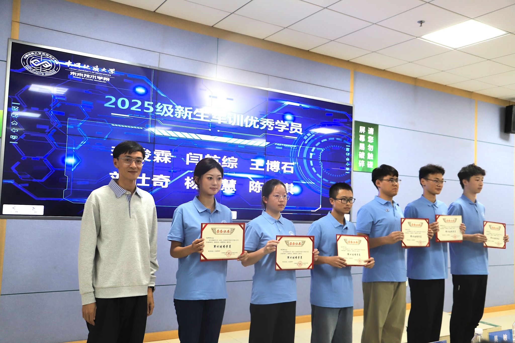 在刚结束的为期半个月的军事训练中,一批同学表现突出,他们不畏艰苦、严于律己,以实际行动践行请党放心,强国有我的青春誓言,展现出新时代青年的昂扬风貌。学院党委副书记杜育为2025级军训优秀学员颁发荣誉证书,勉励大家继续保持优良作风。